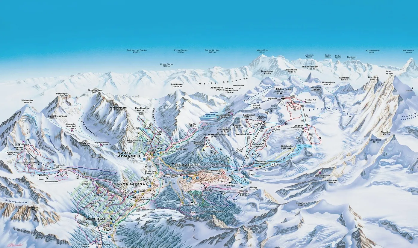 Въпреки че Saas-Fee не предлага голямо разнообразие от писти, всяка от тях предоставя уникални гледки към върховете на Швейцария.